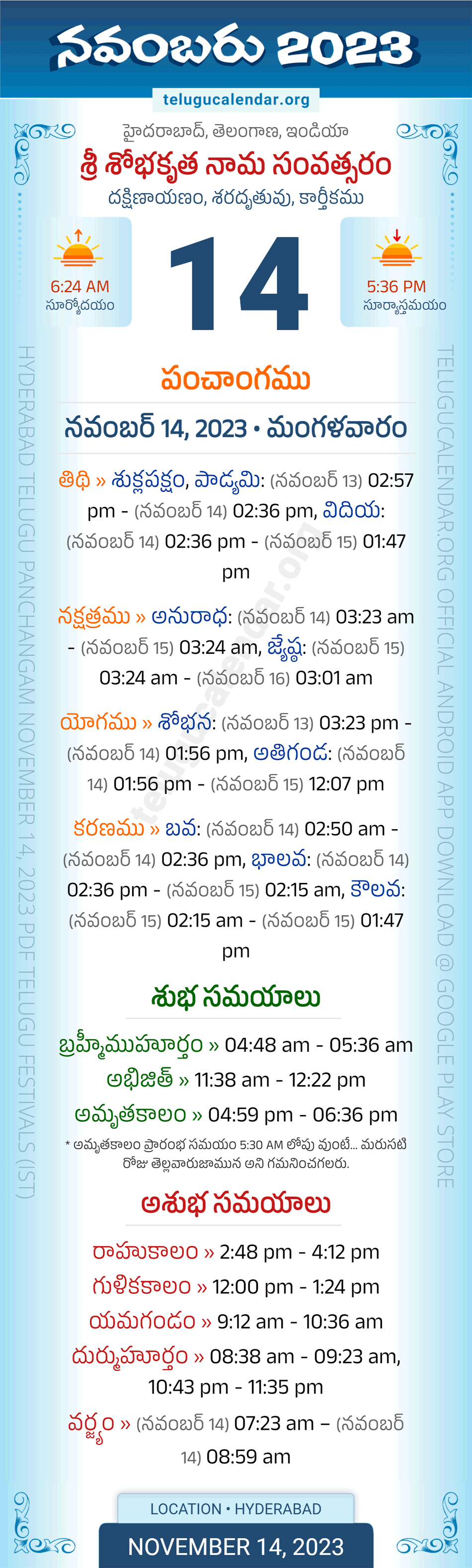 Panchangam November 14, 2023 Telugu Calendar Daily Sheet for Hyderabad (Telangana)... Amavasya Date in November 2023 and Pournami Date in November 2023. Today Telugu Panchangam Date: Tuesday, November 14, 2023, Today Tithi: Sukla Paksham, Padyami: (Nov 13) 02:57 pm - (Nov 14) 02:36 pm, Vidiya: (Nov 14) 02:36 pm - (Nov 15) 01:47 pm, Today Nakshatram: Anuradha: (Nov 14) 03:23 am - (Nov 15) 03:24 am, Jyestha: (Nov 15) 03:24 am - (Nov 16) 03:01 am, Telugu Year: Sri Sobhakritu Nama Samvatsaram, Vedic Aayana: Dakshinayanam, Vedic Rutuvu: Sharad, Chandramasa (Amanta): Kartikamu. Below image showing information about the 5 attributes of the day, viz., Varam, Tithi, Nakshatram, Yogam & Karanam along with starting and end timings. Read more