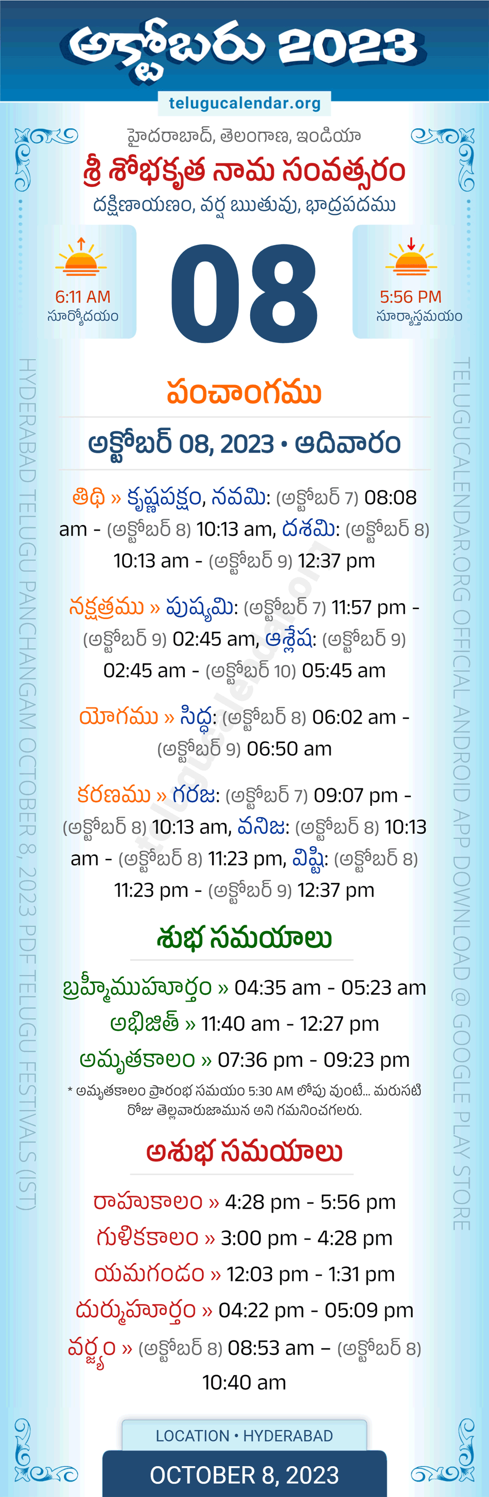 Download » October 8, 2023 » Hyderabad, Telangana Telugu Calendar Panchangam Daily Sheet with Auspicious and Inauspicious Timings.