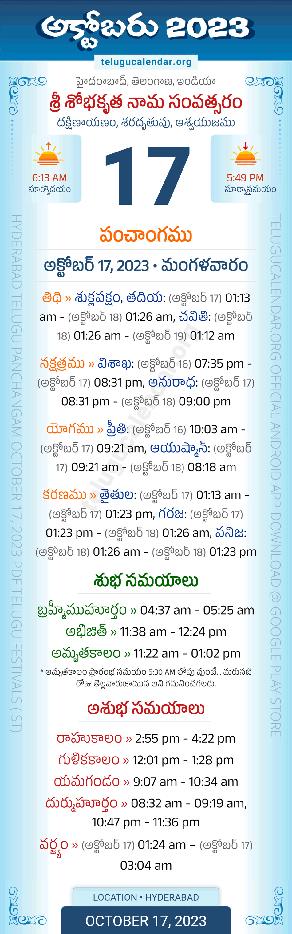 Download » October 17, 2023 » Hyderabad, Telangana Telugu Calendar Panchangam Daily Sheet with Auspicious and Inauspicious Timings.