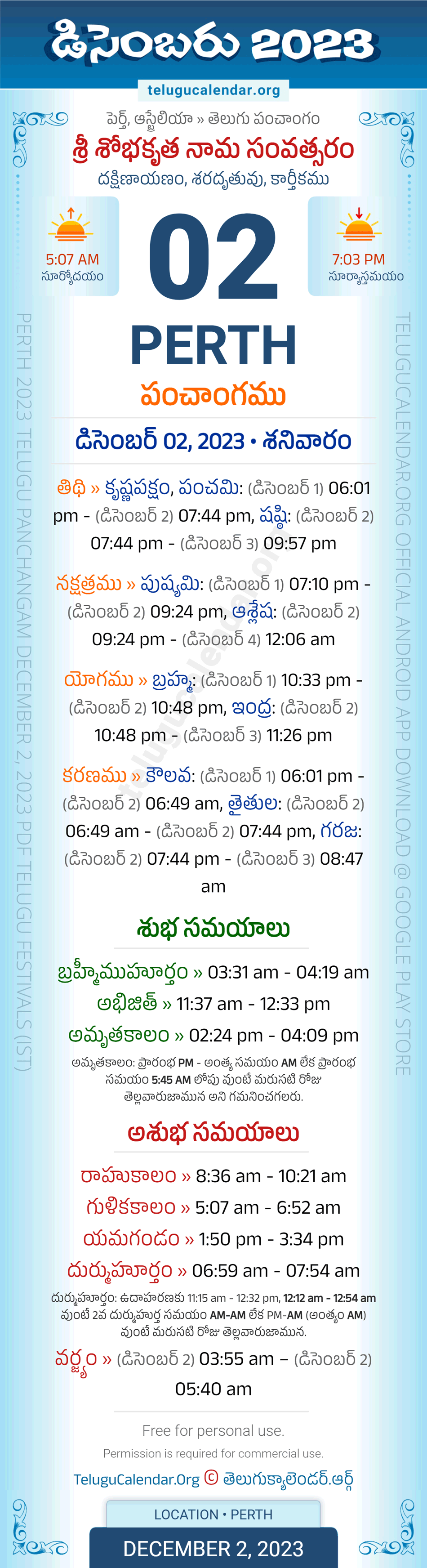 Download » December 2, 2023 » Perth (Australia) Telugu Panchangam Daily Sheet with Auspicious and Inauspicious Timings.