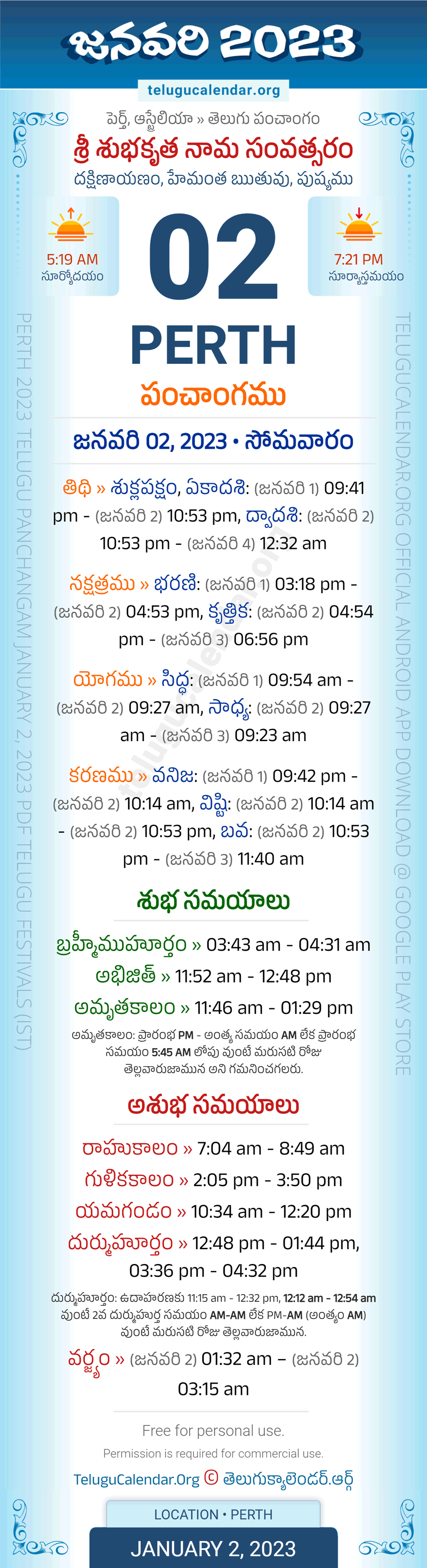 Download » January 2, 2023 » Perth (Australia) Telugu Panchangam Daily Sheet with Auspicious and Inauspicious Timings.