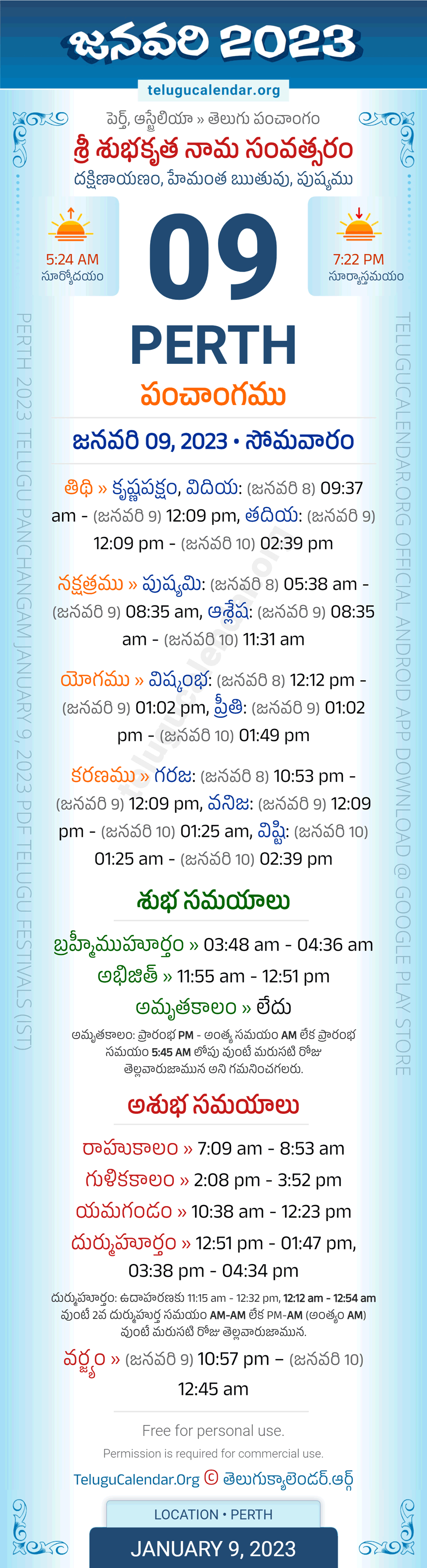Download » January 9, 2023 » Perth (Australia) Telugu Panchangam Daily Sheet with Auspicious and Inauspicious Timings.