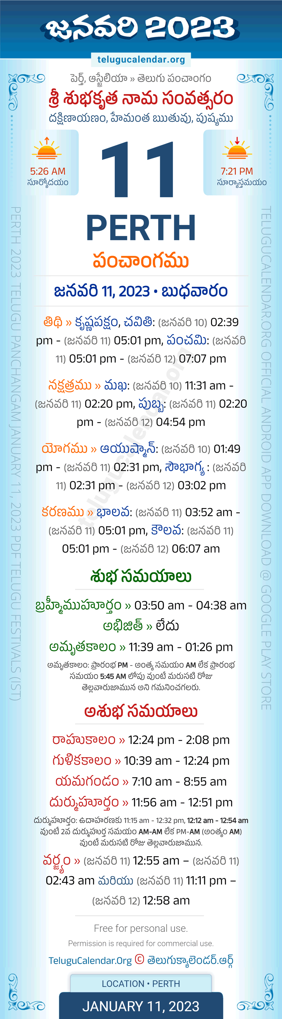 Download » January 11, 2023 » Perth (Australia) Telugu Panchangam Daily Sheet with Auspicious and Inauspicious Timings.