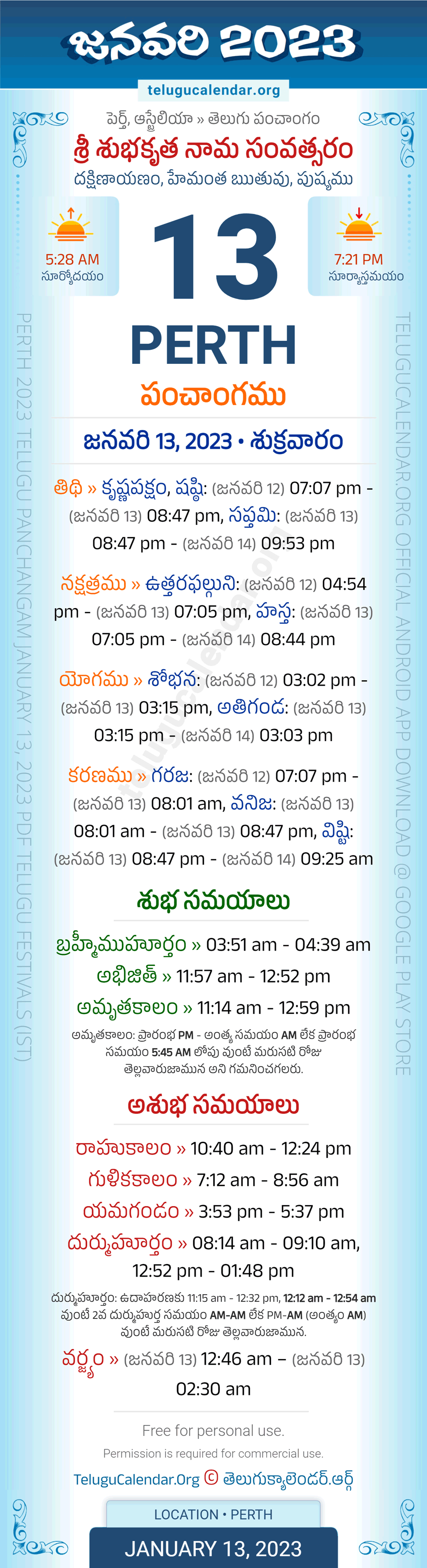 Download » January 13, 2023 » Perth (Australia) Telugu Panchangam Daily Sheet with Auspicious and Inauspicious Timings.