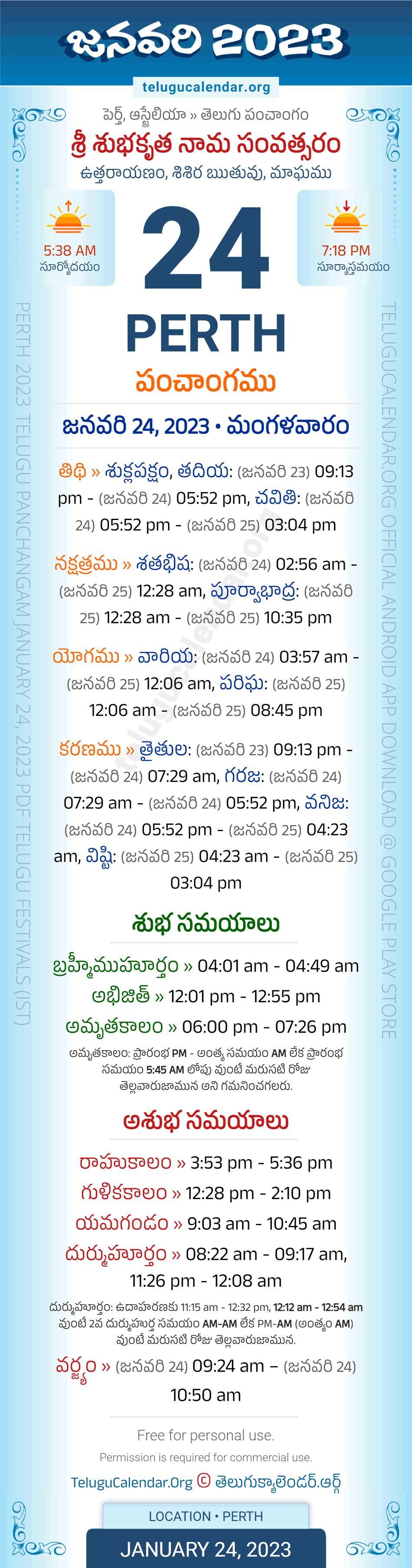 Download » January 24, 2023 » Perth (Australia) Telugu Panchangam Daily Sheet with Auspicious and Inauspicious Timings.