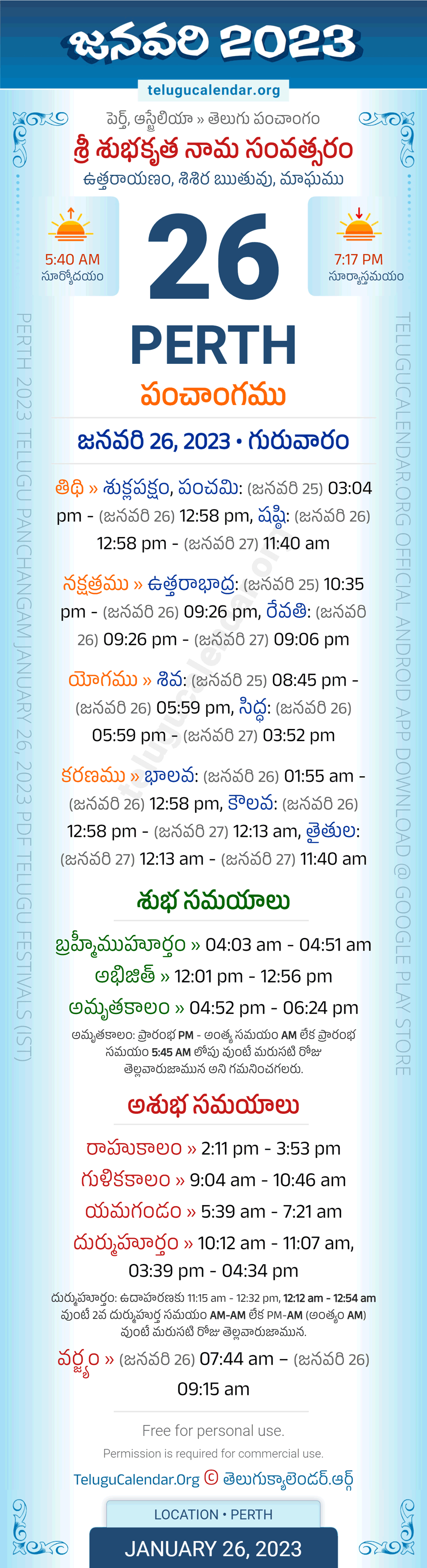 Download » January 26, 2023 » Perth (Australia) Telugu Panchangam Daily Sheet with Auspicious and Inauspicious Timings.