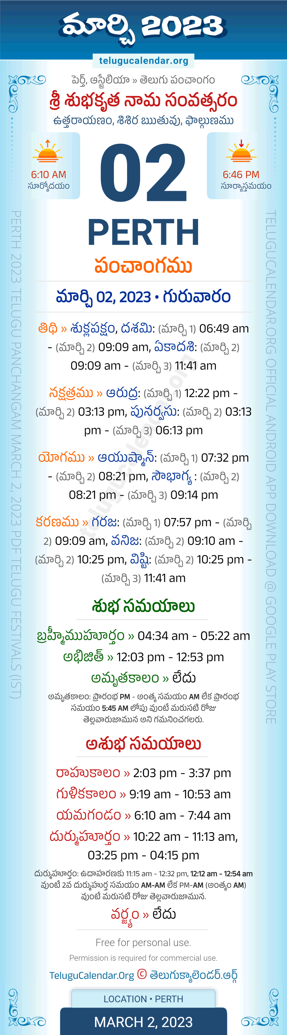 Download » March 2, 2023 » Perth (Australia) Telugu Panchangam Daily Sheet with Auspicious and Inauspicious Timings.