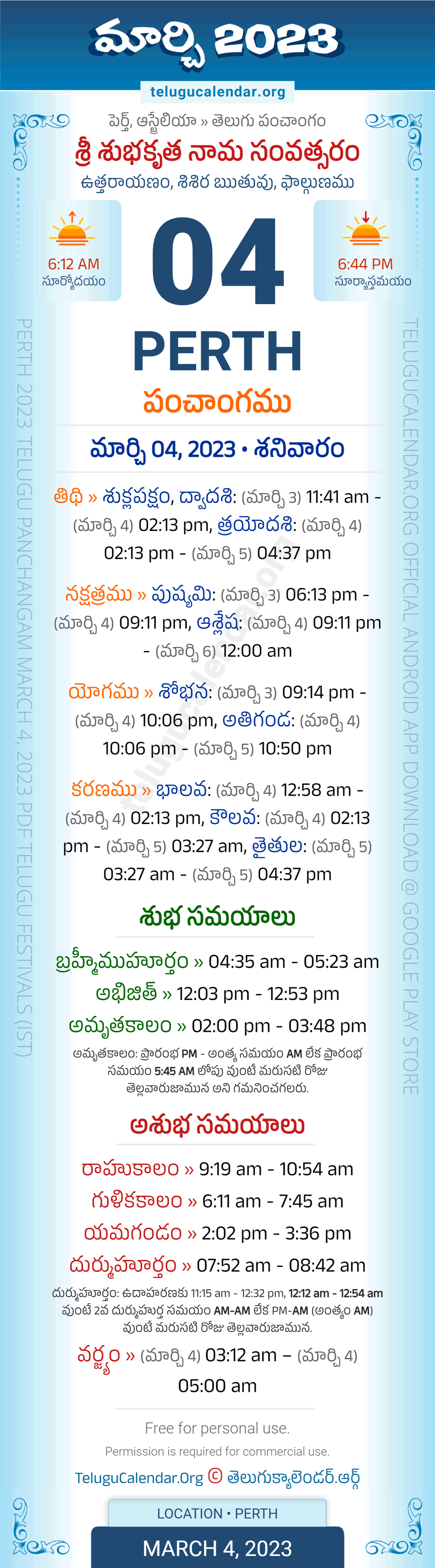 Download » March 4, 2023 » Perth (Australia) Telugu Panchangam Daily Sheet with Auspicious and Inauspicious Timings.
