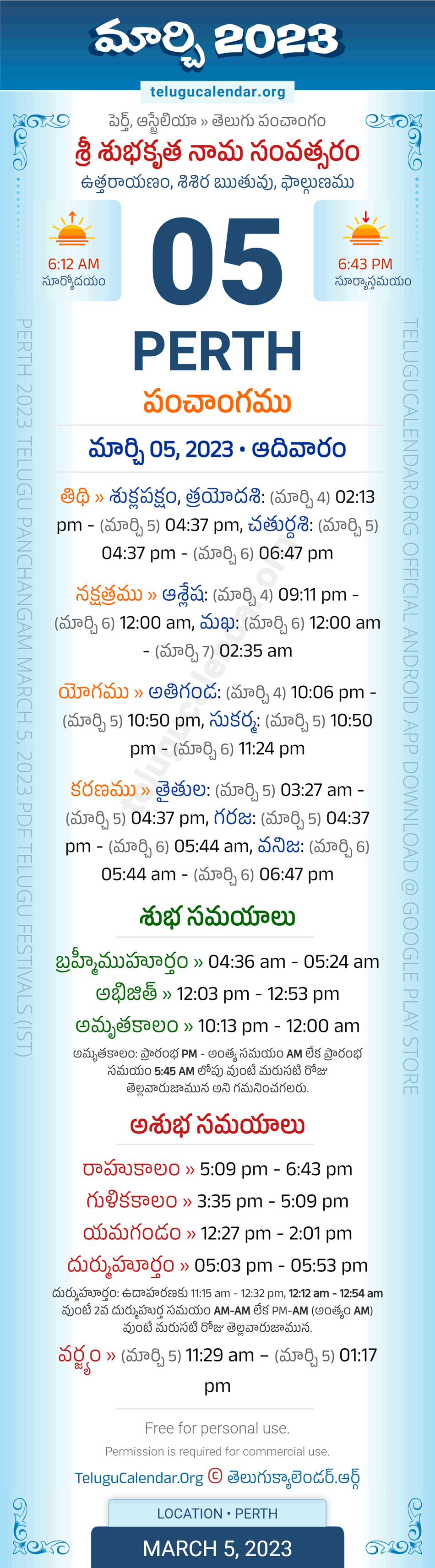 Download » March 5, 2023 » Perth (Australia) Telugu Panchangam Daily Sheet with Auspicious and Inauspicious Timings.
