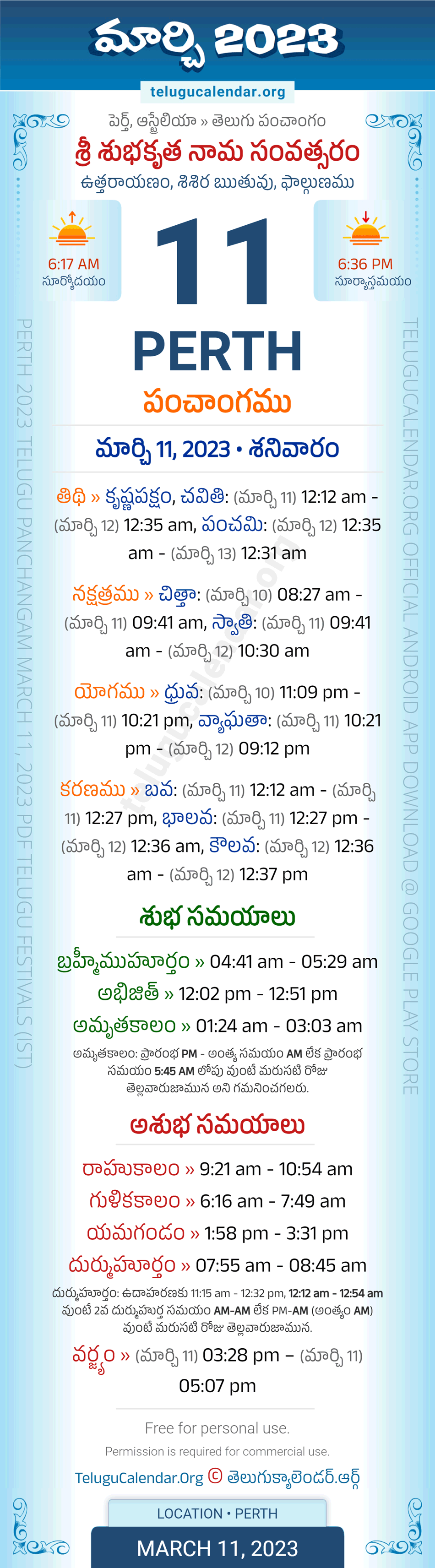 Download » March 11, 2023 » Perth (Australia) Telugu Panchangam Daily Sheet with Auspicious and Inauspicious Timings.