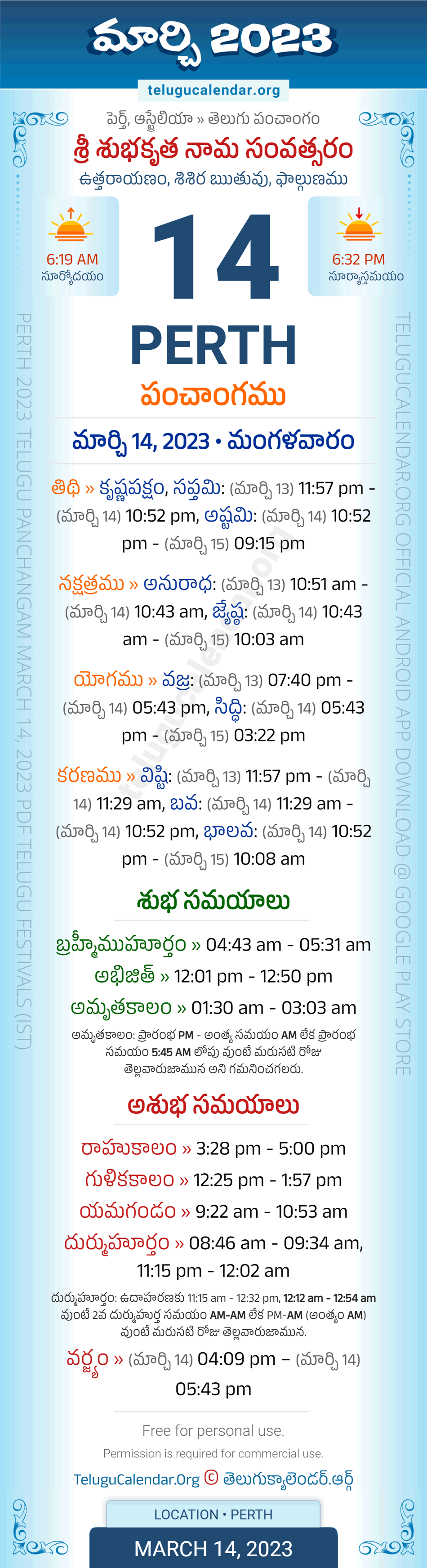 Download » March 14, 2023 » Perth (Australia) Telugu Panchangam Daily Sheet with Auspicious and Inauspicious Timings.