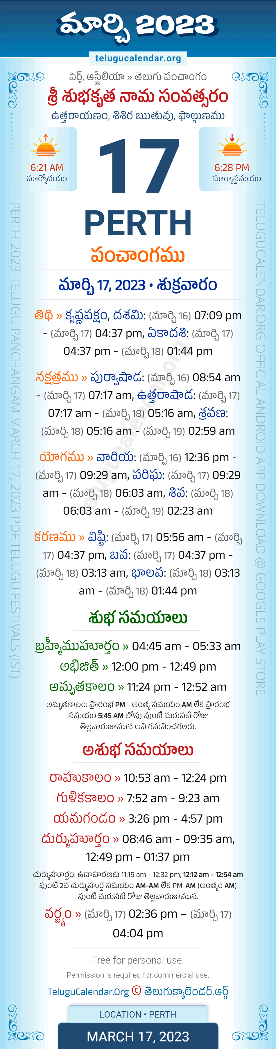 Download » March 17, 2023 » Perth (Australia) Telugu Panchangam Daily Sheet with Auspicious and Inauspicious Timings.