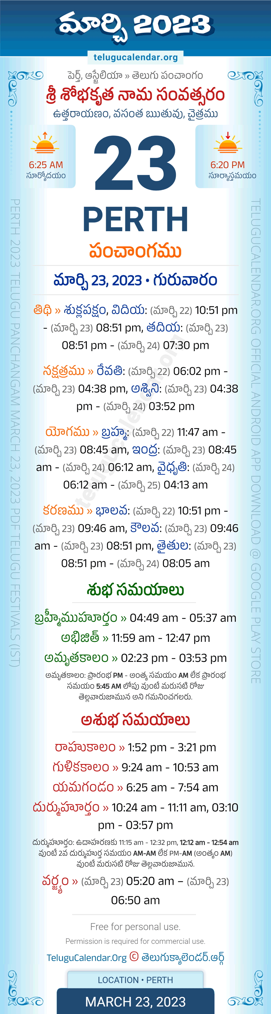Download » March 23, 2023 » Perth (Australia) Telugu Panchangam Daily Sheet with Auspicious and Inauspicious Timings.