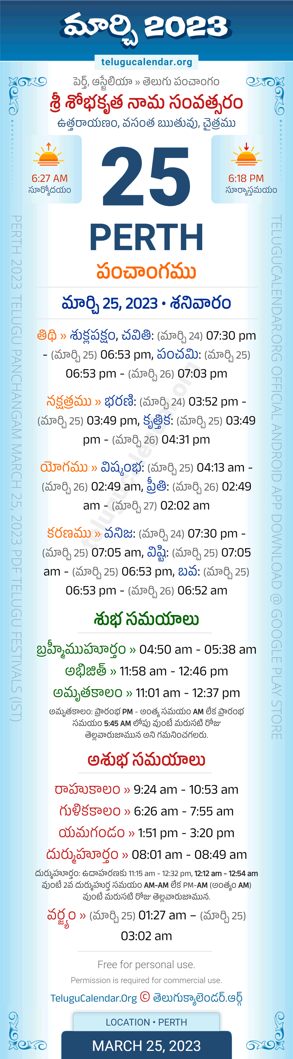 Perth Panchangam March 25, 2023 Daily Sheet in Telugu... Perth Telugu Panchangam Saturday, March 25, 2023, Today's Perth Tithi: Sukla Paksham, Chavithi: (Mar 24) 07:30 pm - (Mar 25) 06:53 pm, Panchami: (Mar 25) 06:53 pm - (Mar 26) 07:03 pm, Today's Perth Nakshatram: Bharani: (Mar 24) 03:52 pm - (Mar 25) 03:49 pm, Krithika: (Mar 25) 03:49 pm - (Mar 26) 04:31 pm, Telugu Year: Sri Sobhakritu Nama Samvatsaram, Vedic Aayana: Uttarayanam, Vedic Rutuvu: Vasanta, Chandramasa (Amanta): Chaitramu. Below image showing information about the 5 attributes of the day, viz., Varam, Tithi, Nakshatram, Yogam & Karanam along with starting and end timings. Read more