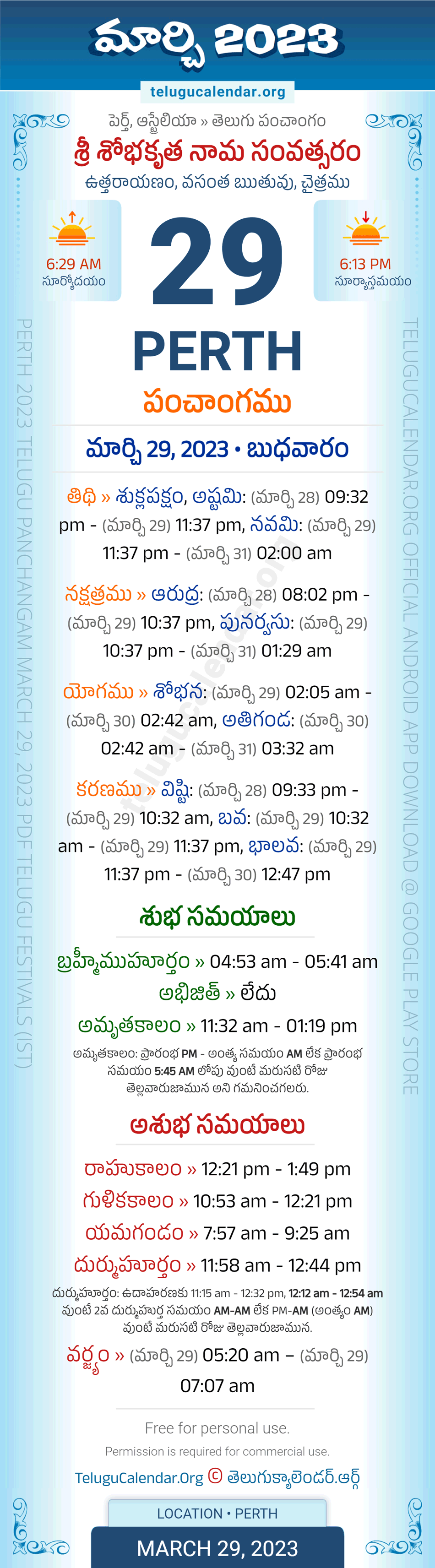 Perth Panchangam March 29, 2023 Daily Sheet in Telugu... Perth Telugu Panchangam Wednesday, March 29, 2023, Today's Perth Tithi: Sukla Paksham, Ashtami: (Mar 28) 09:32 pm - (Mar 29) 11:37 pm, Navami: (Mar 29) 11:37 pm - (Mar 31) 02:00 am, Today's Perth Nakshatram: Arudra: (Mar 28) 08:02 pm - (Mar 29) 10:37 pm, Punarvasu: (Mar 29) 10:37 pm - (Mar 31) 01:29 am, Telugu Year: Sri Sobhakritu Nama Samvatsaram, Vedic Aayana: Uttarayanam, Vedic Rutuvu: Vasanta, Chandramasa (Amanta): Chaitramu. Below image showing information about the 5 attributes of the day, viz., Varam, Tithi, Nakshatram, Yogam & Karanam along with starting and end timings. Read more