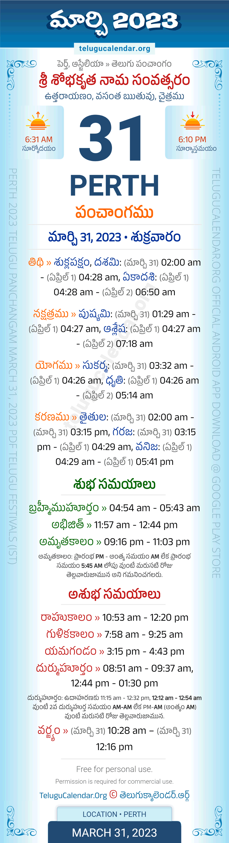 Download » March 31, 2023 » Perth (Australia) Telugu Panchangam Daily Sheet with Auspicious and Inauspicious Timings.