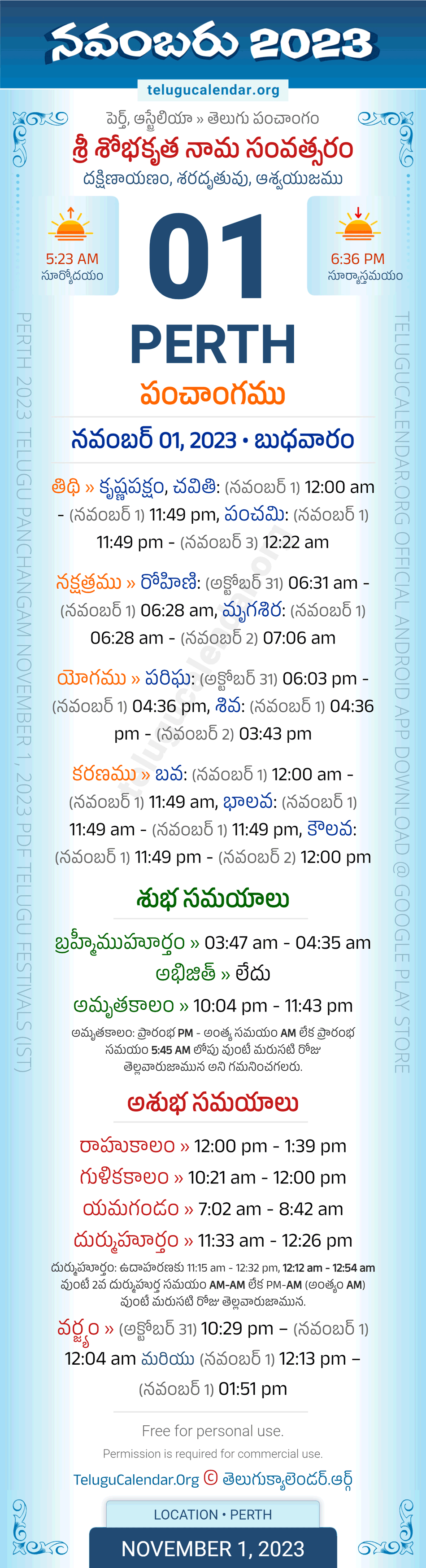 Download » November 1, 2023 » Perth (Australia) Telugu Panchangam Daily Sheet with Auspicious and Inauspicious Timings.