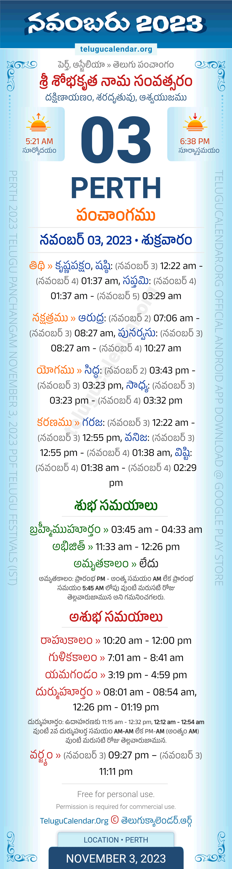 Download » November 3, 2023 » Perth (Australia) Telugu Panchangam Daily Sheet with Auspicious and Inauspicious Timings.