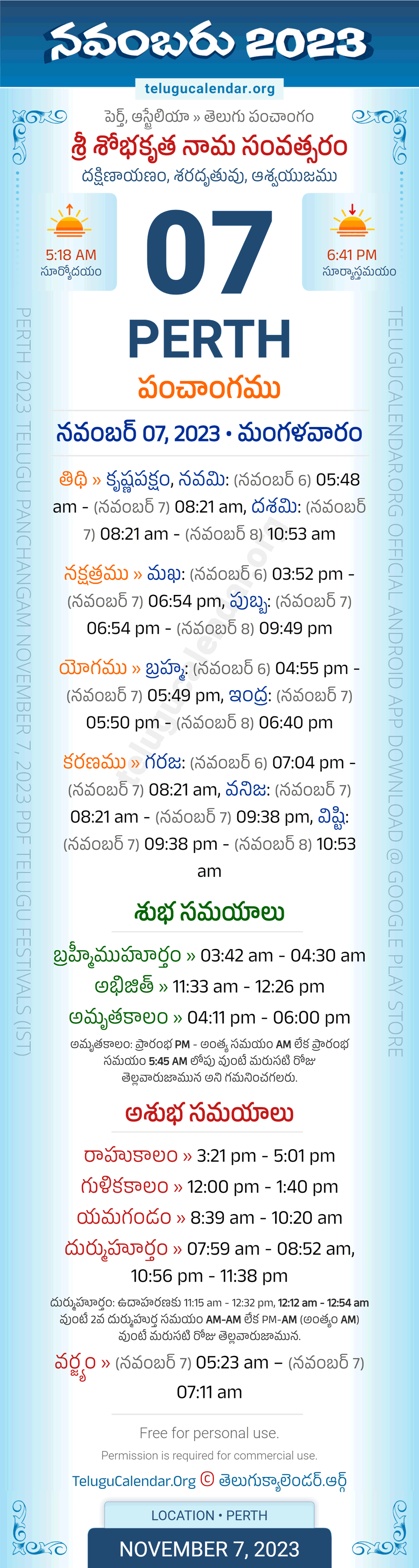 Download » November 7, 2023 » Perth (Australia) Telugu Panchangam Daily Sheet with Auspicious and Inauspicious Timings.