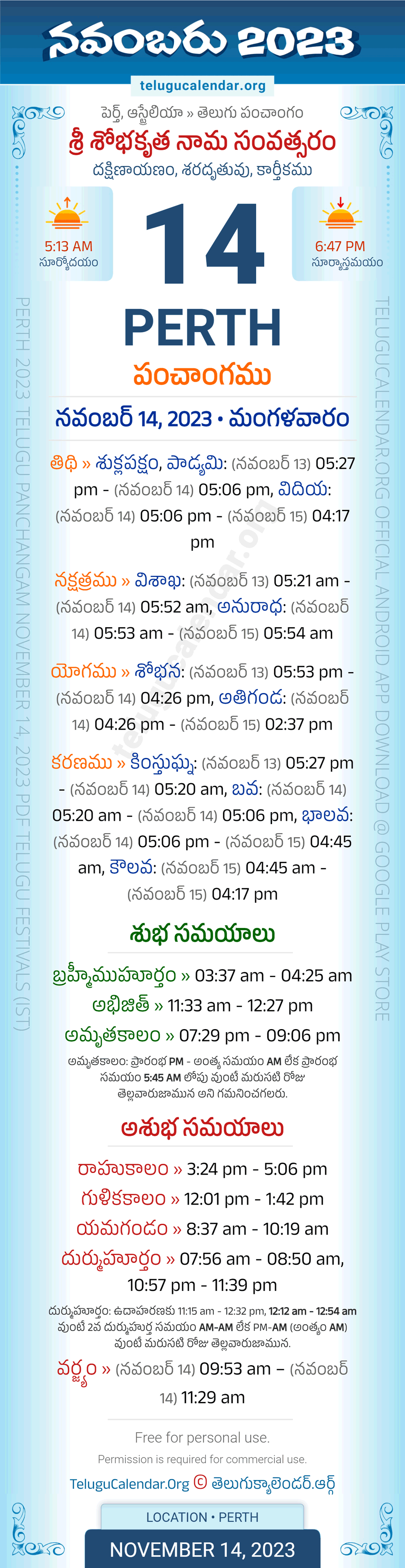 Download » November 14, 2023 » Perth (Australia) Telugu Panchangam Daily Sheet with Auspicious and Inauspicious Timings.