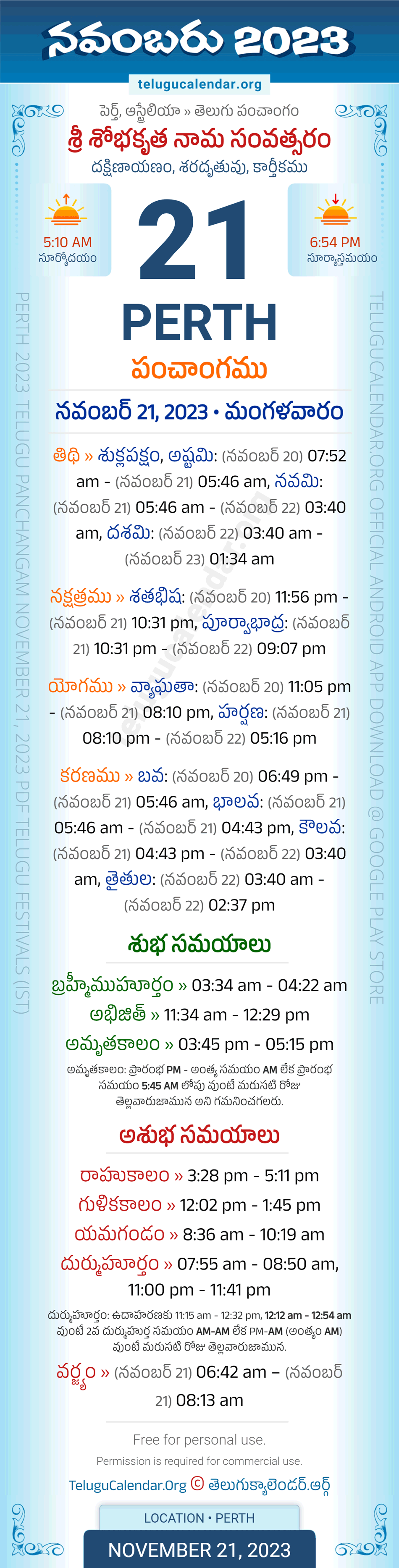Download » November 21, 2023 » Perth (Australia) Telugu Panchangam Daily Sheet with Auspicious and Inauspicious Timings.