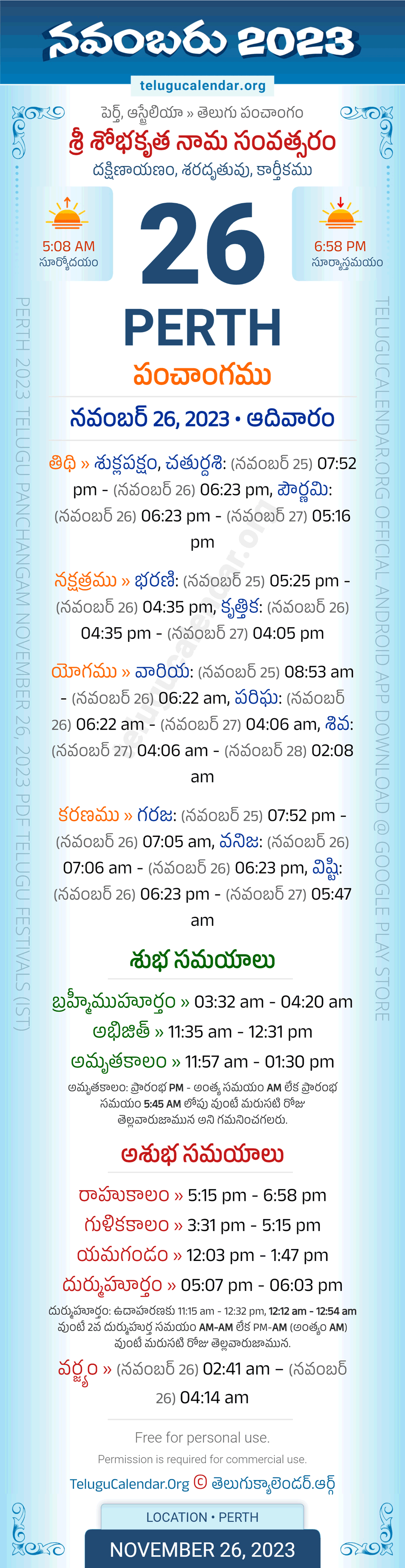 Download » November 26, 2023 » Perth (Australia) Telugu Panchangam Daily Sheet with Auspicious and Inauspicious Timings.