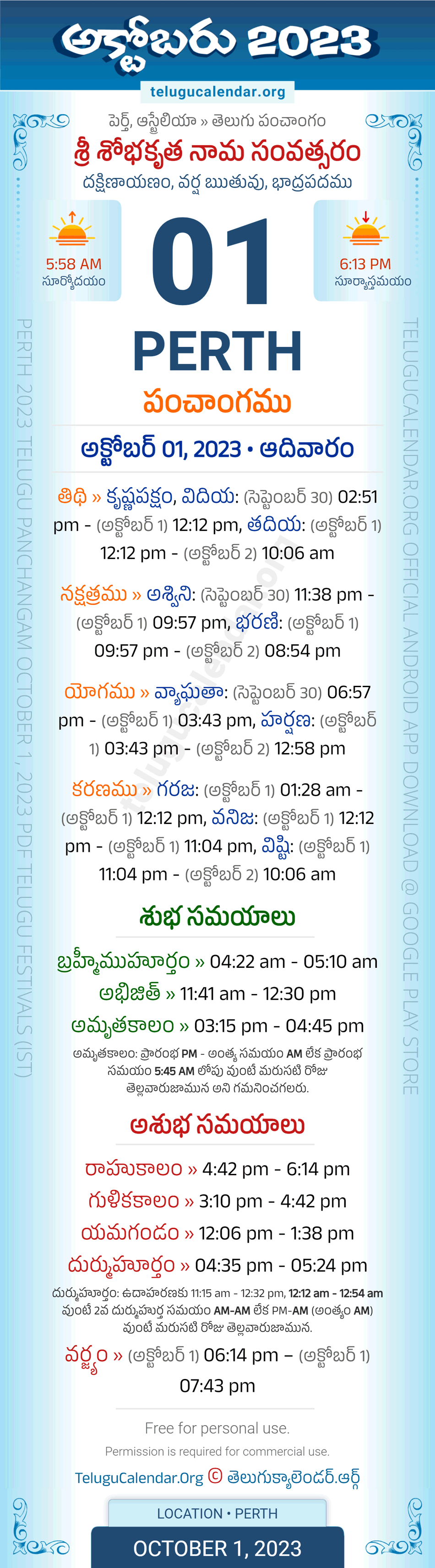 Download » October 1, 2023 » Perth (Australia) Telugu Panchangam Daily Sheet with Auspicious and Inauspicious Timings.