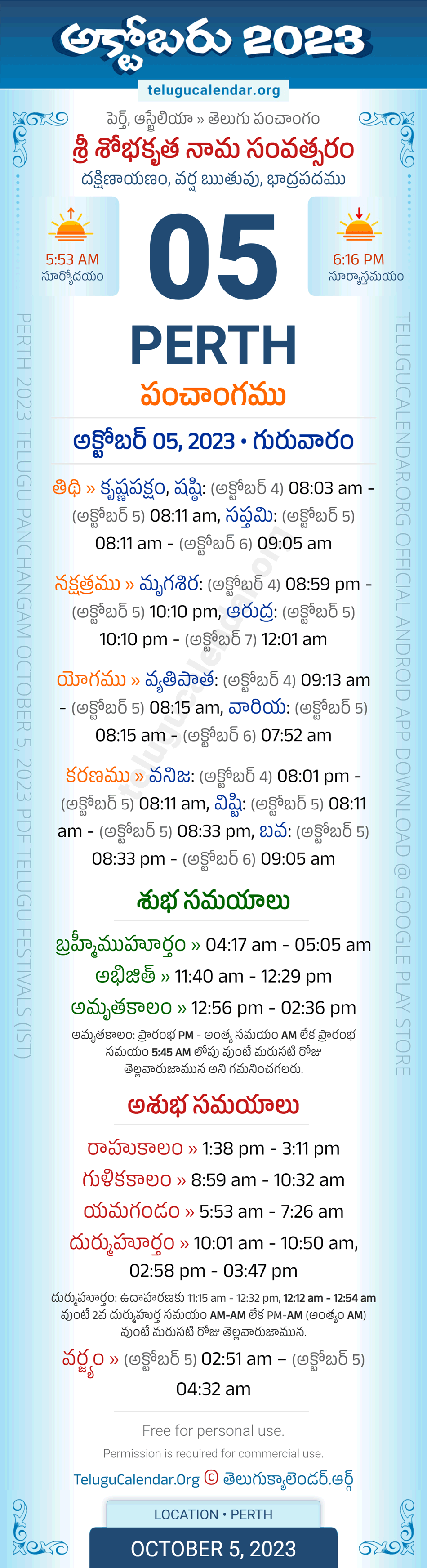 Perth Panchangam October 5, 2023 Daily Sheet in Telugu... Perth Telugu Panchangam Thursday, October 05, 2023, Today's Perth Tithi: Krishna Paksham, Shashthi: (Oct 4) 08:03 am - (Oct 5) 08:11 am, Saptami: (Oct 5) 08:11 am - (Oct 6) 09:05 am, Today's Perth Nakshatram: Mrigasira: (Oct 4) 08:59 pm - (Oct 5) 10:10 pm, Arudra: (Oct 5) 10:10 pm - (Oct 7) 12:01 am, Telugu Year: Sri Sobhakritu Nama Samvatsaram, Vedic Aayana: Dakshinayanam, Vedic Rutuvu: Varsha, Chandramasa (Amanta): Bhadrapadamu. Below image showing information about the 5 attributes of the day, viz., Varam, Tithi, Nakshatram, Yogam & Karanam along with starting and end timings. Read more