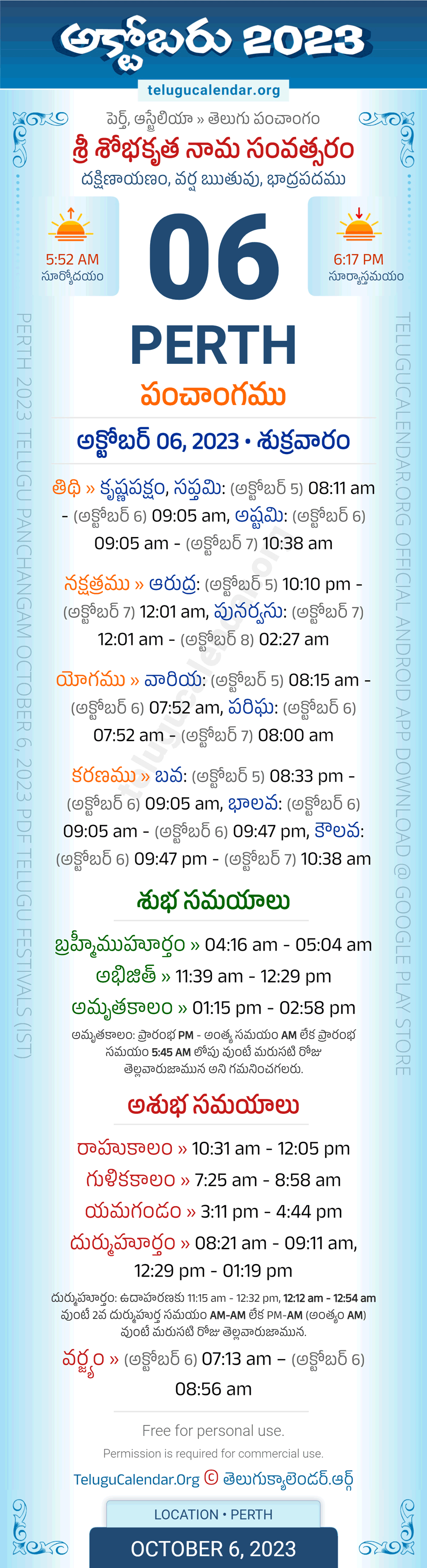 Download » October 6, 2023 » Perth (Australia) Telugu Panchangam Daily Sheet with Auspicious and Inauspicious Timings.