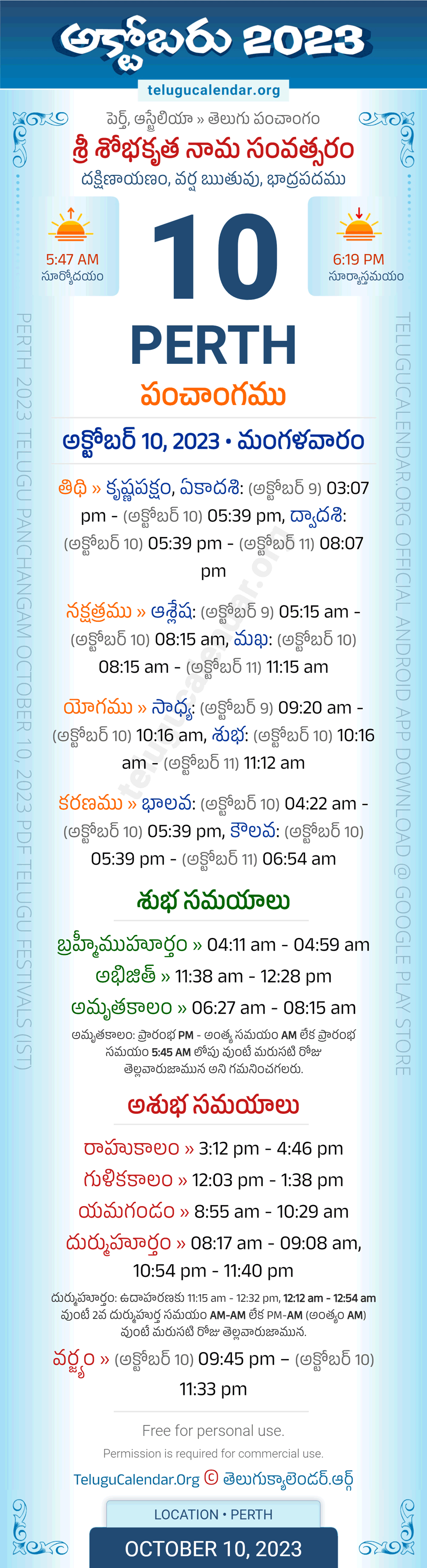 Download » October 10, 2023 » Perth (Australia) Telugu Panchangam Daily Sheet with Auspicious and Inauspicious Timings.