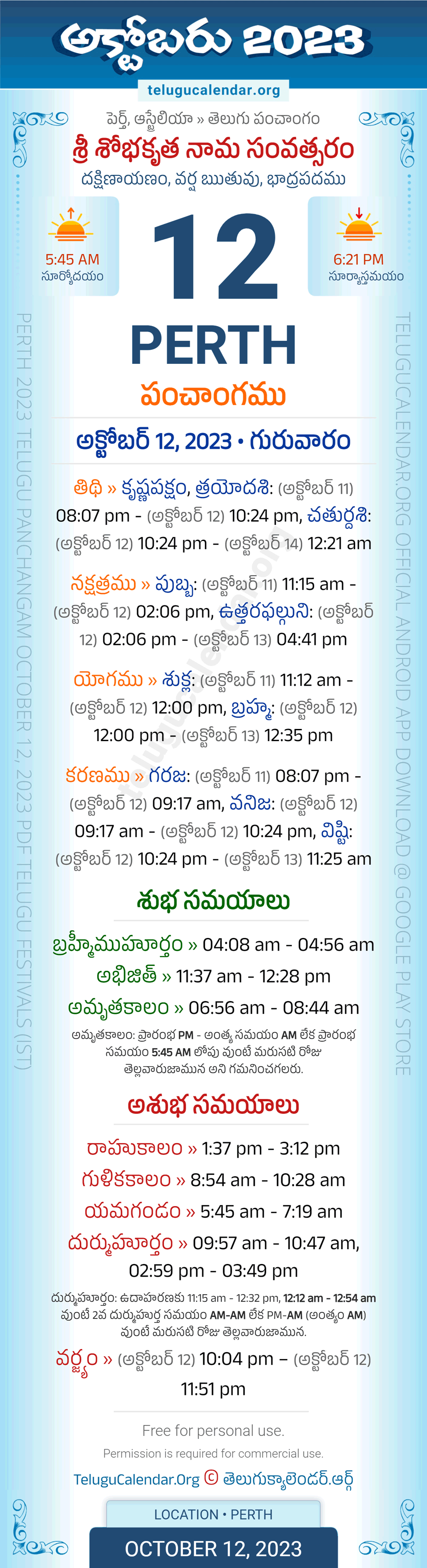 Download » October 12, 2023 » Perth (Australia) Telugu Panchangam Daily Sheet with Auspicious and Inauspicious Timings.