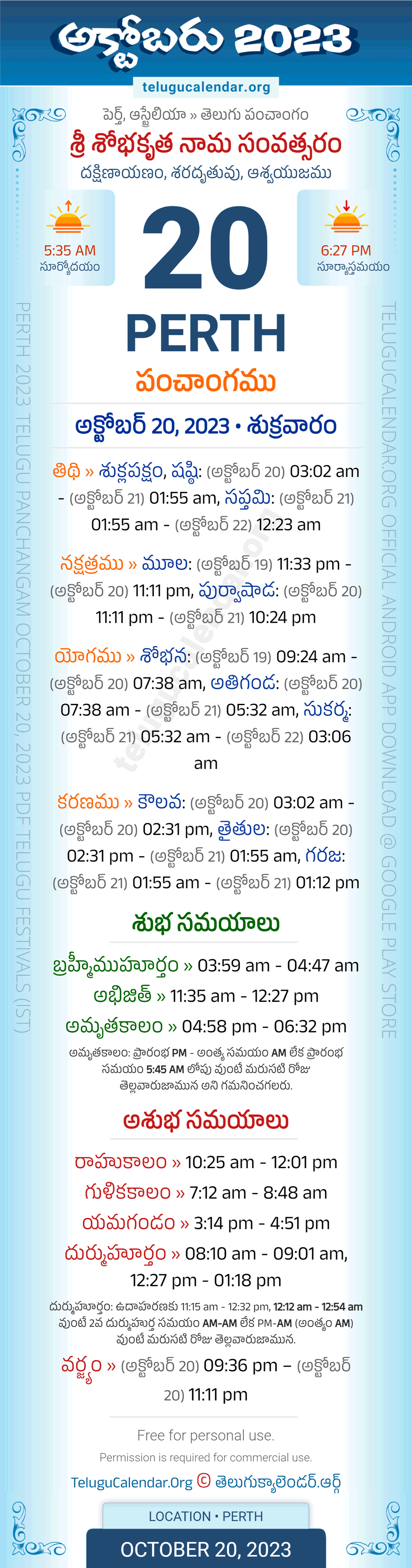 Perth Panchangam October 20, 2023 Daily Sheet in Telugu... Perth Telugu Panchangam Friday, October 20, 2023, Today's Perth Tithi: Sukla Paksham, Shashthi: (Oct 20) 03:02 am - (Oct 21) 01:55 am, Saptami: (Oct 21) 01:55 am - (Oct 22) 12:23 am, Today's Perth Nakshatram: Moola: (Oct 19) 11:33 pm - (Oct 20) 11:11 pm, Purva Ashadha: (Oct 20) 11:11 pm - (Oct 21) 10:24 pm, Telugu Year: Sri Sobhakritu Nama Samvatsaram, Vedic Aayana: Dakshinayanam, Vedic Rutuvu: Sharad, Chandramasa (Amanta): Ashwayujamu. Below image showing information about the 5 attributes of the day, viz., Varam, Tithi, Nakshatram, Yogam & Karanam along with starting and end timings. Read more