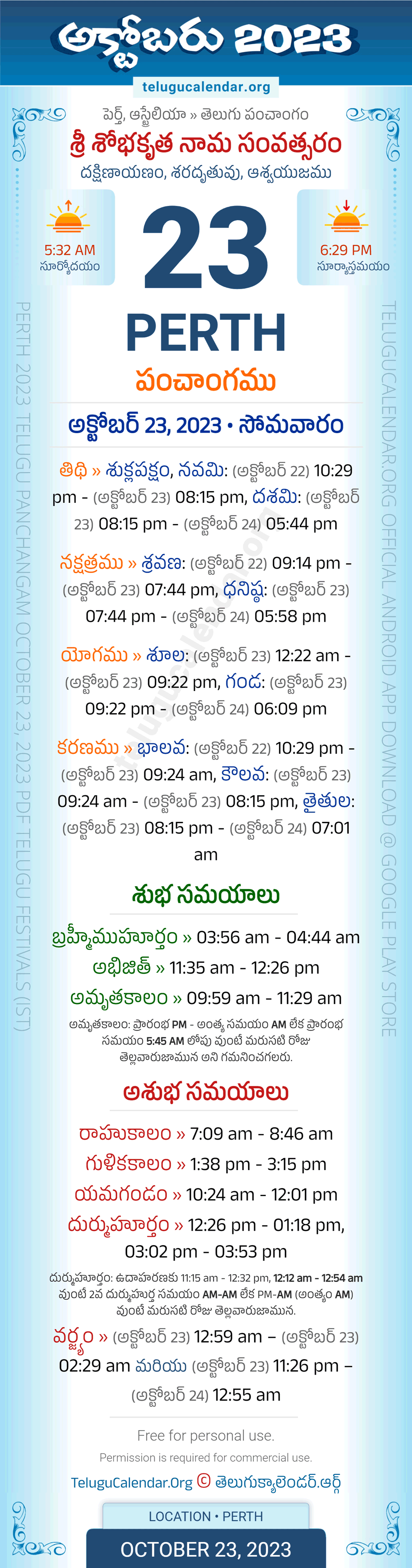 Download » October 23, 2023 » Perth (Australia) Telugu Panchangam Daily Sheet with Auspicious and Inauspicious Timings.