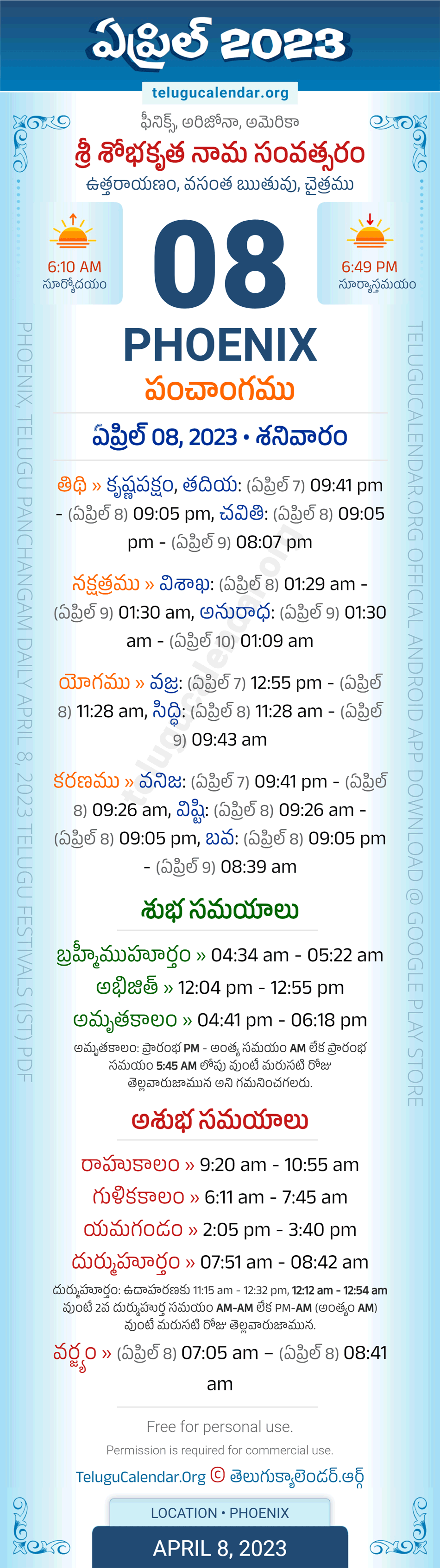 Download » April 8, 2023 » Phoenix (USA) Telugu Panchangam Daily Sheet with Auspicious and Inauspicious Timings.