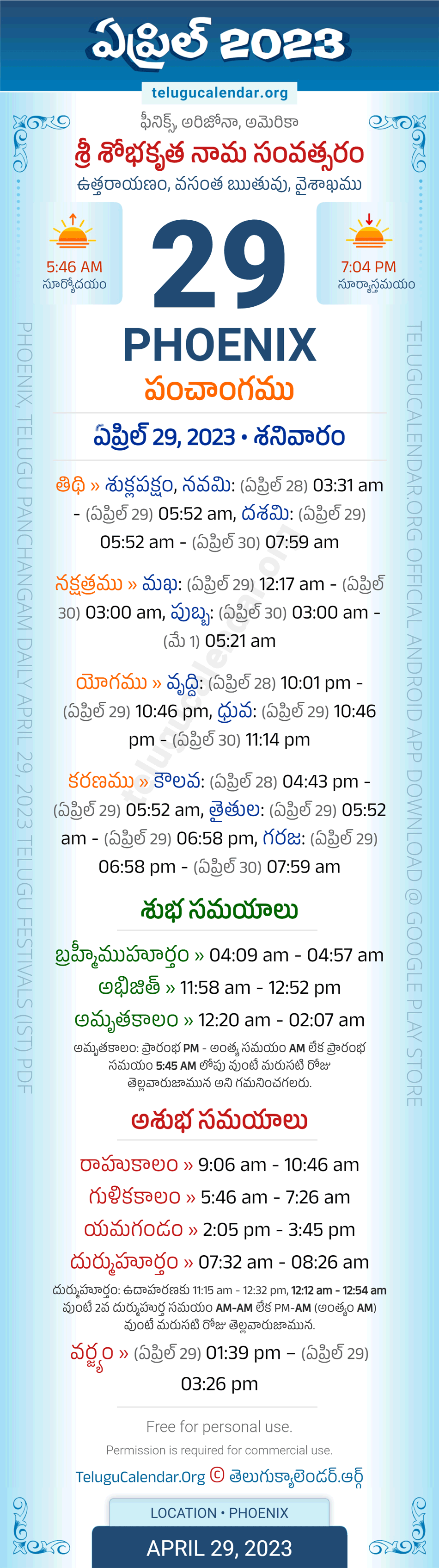 Download » April 29, 2023 » Phoenix (USA) Telugu Panchangam Daily Sheet with Auspicious and Inauspicious Timings.