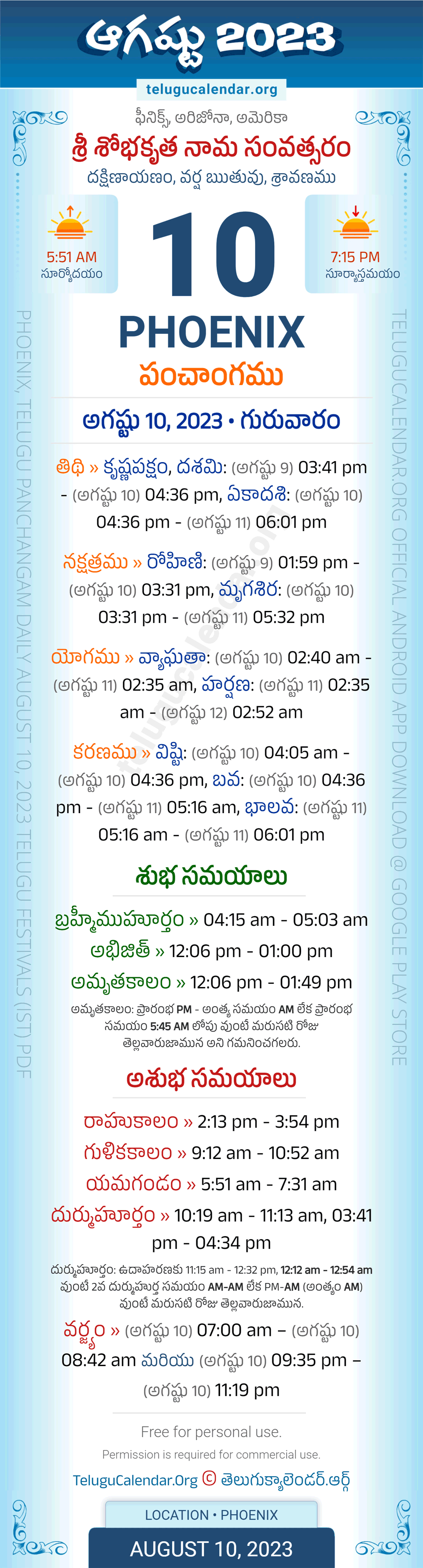 Download » August 10, 2023 » Phoenix (USA) Telugu Panchangam Daily Sheet with Auspicious and Inauspicious Timings.