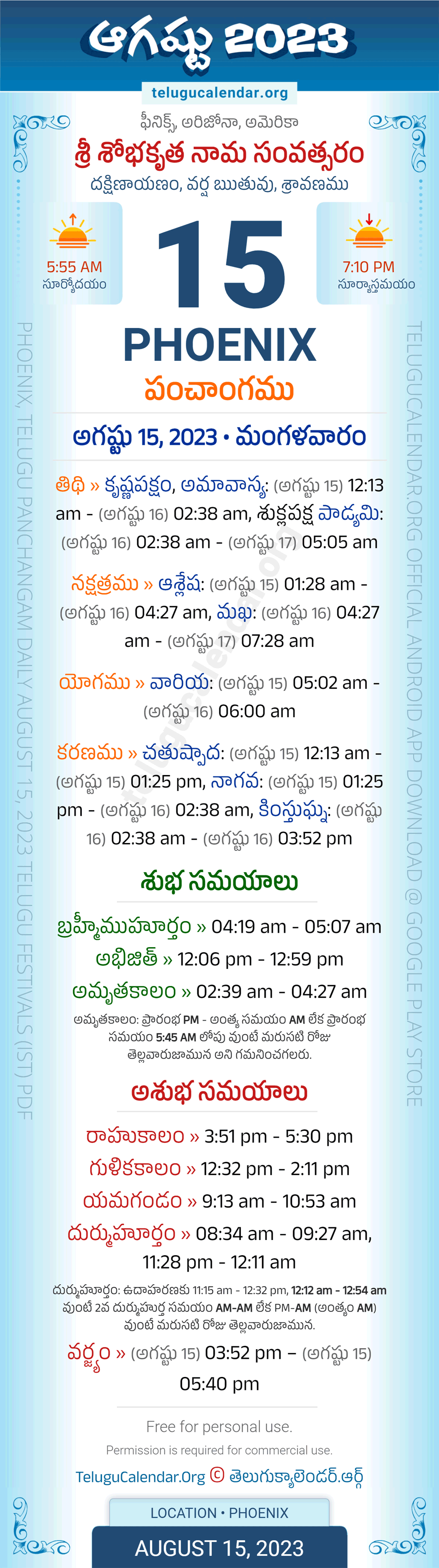Download » August 15, 2023 » Phoenix (USA) Telugu Panchangam Daily Sheet with Auspicious and Inauspicious Timings.