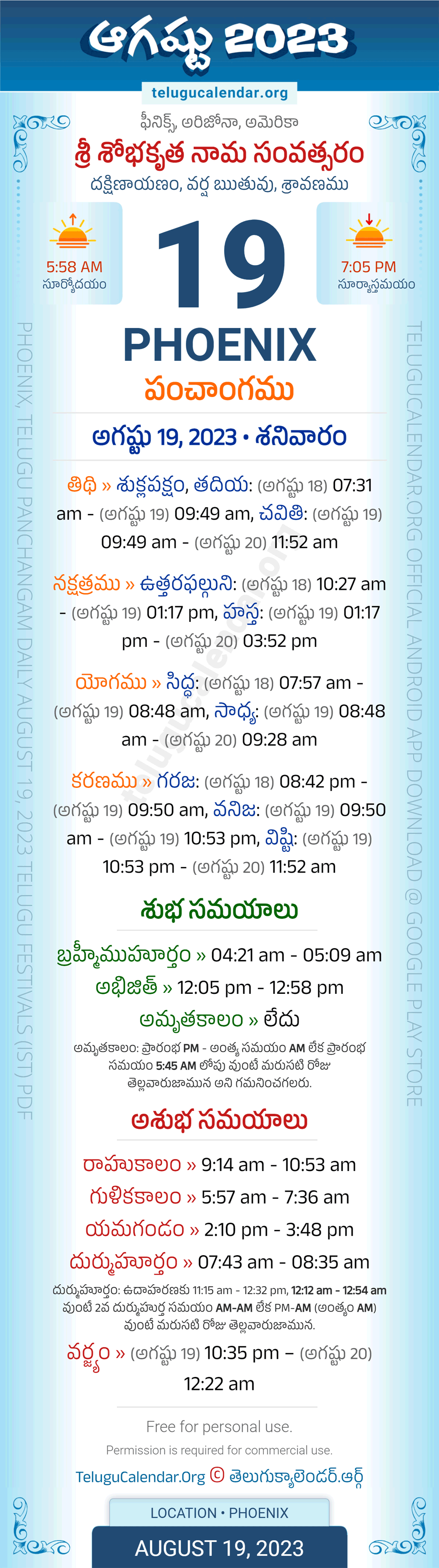 Download » August 19, 2023 » Phoenix (USA) Telugu Panchangam Daily Sheet with Auspicious and Inauspicious Timings.