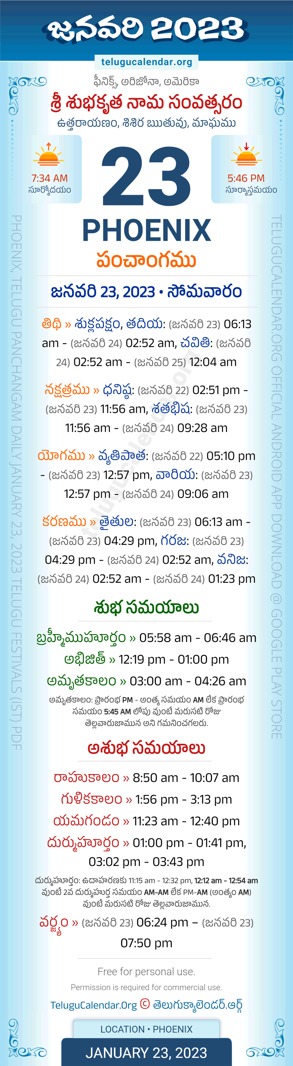 Download » January 23, 2023 » Phoenix (USA) Telugu Panchangam Daily Sheet with Auspicious and Inauspicious Timings.