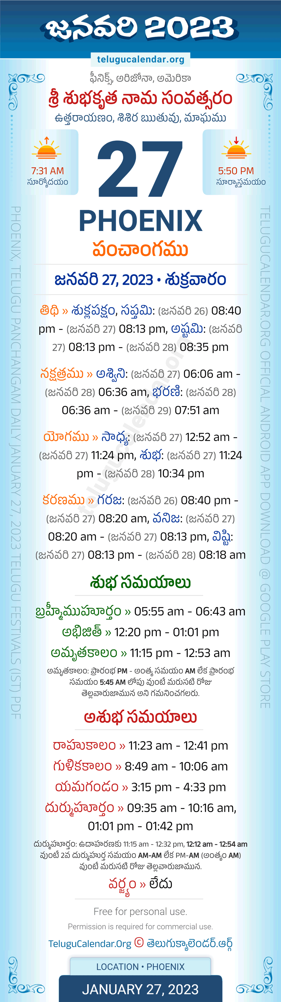 Download » January 27, 2023 » Phoenix (USA) Telugu Panchangam Daily Sheet with Auspicious and Inauspicious Timings.