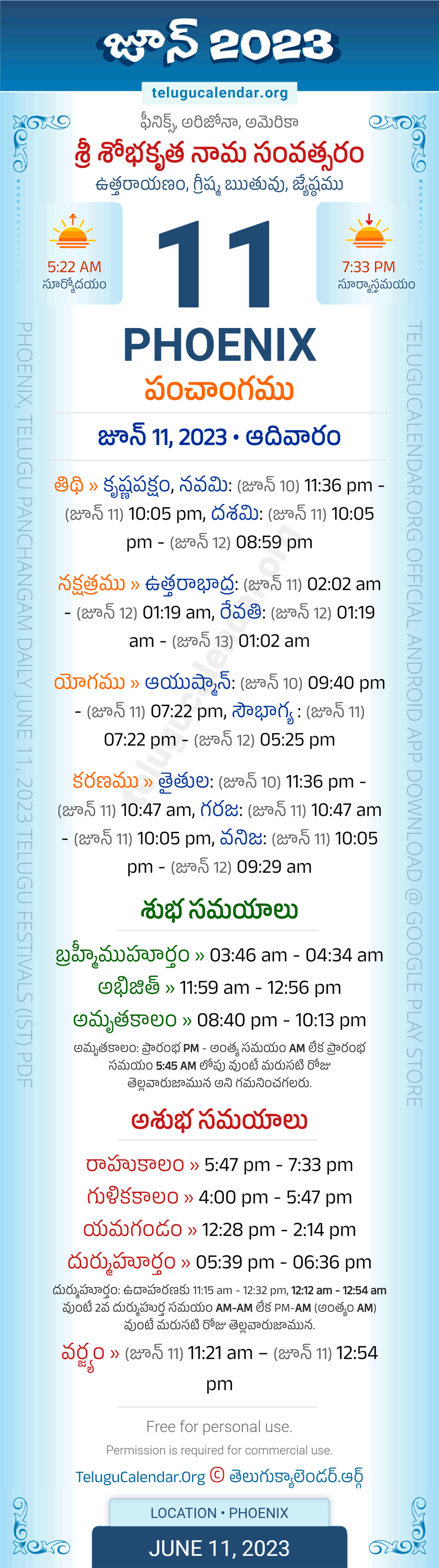 Download » June 11, 2023 » Phoenix (USA) Telugu Panchangam Daily Sheet with Auspicious and Inauspicious Timings.