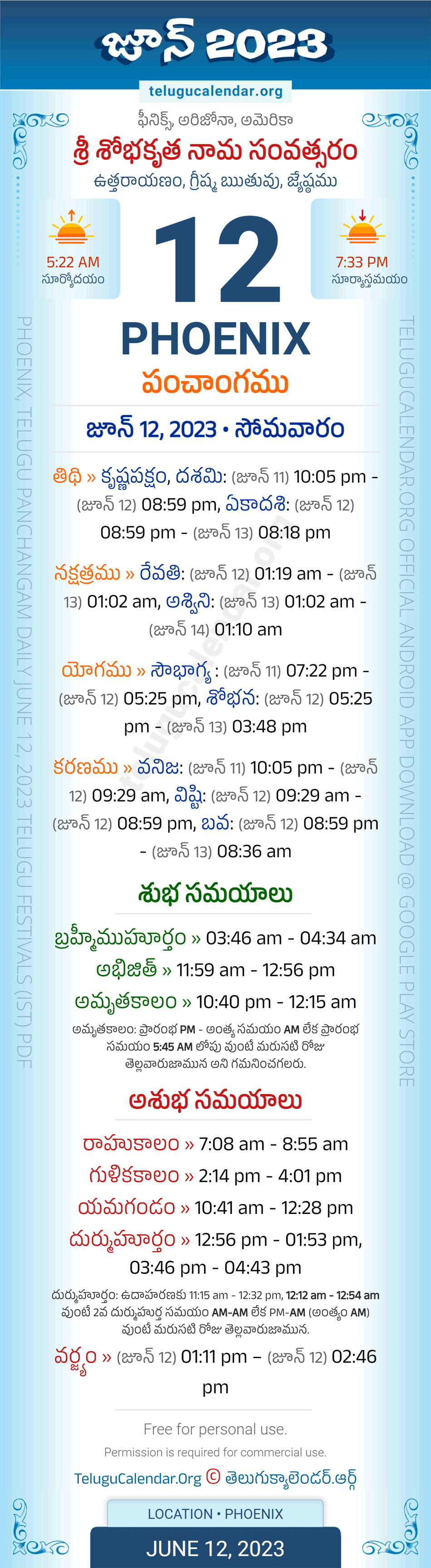 Download » June 12, 2023 » Phoenix (USA) Telugu Panchangam Daily Sheet with Auspicious and Inauspicious Timings.