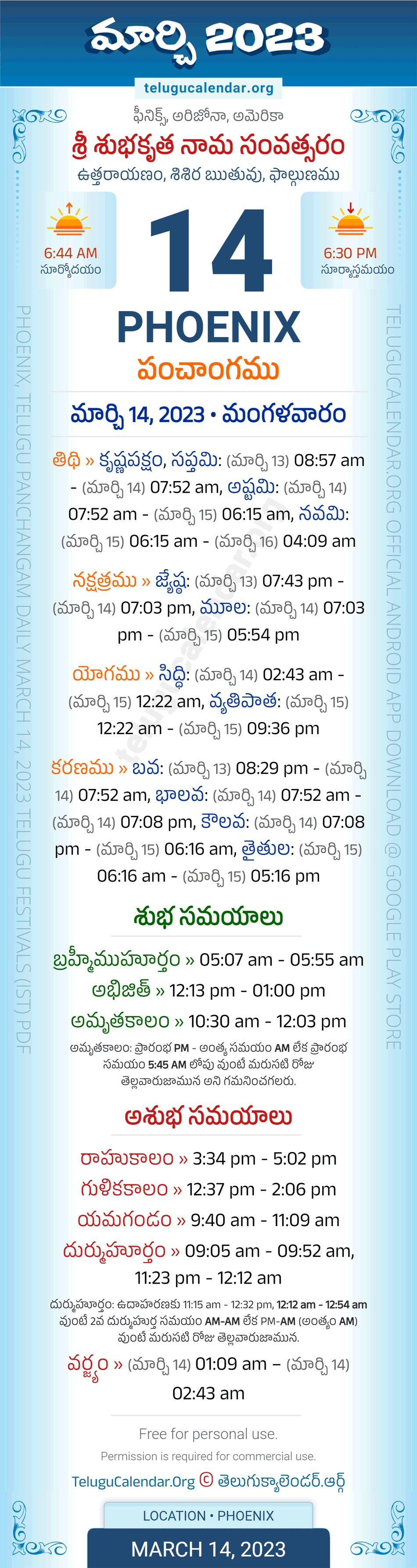 Download » March 14, 2023 » Phoenix (USA) Telugu Panchangam Daily Sheet with Auspicious and Inauspicious Timings.