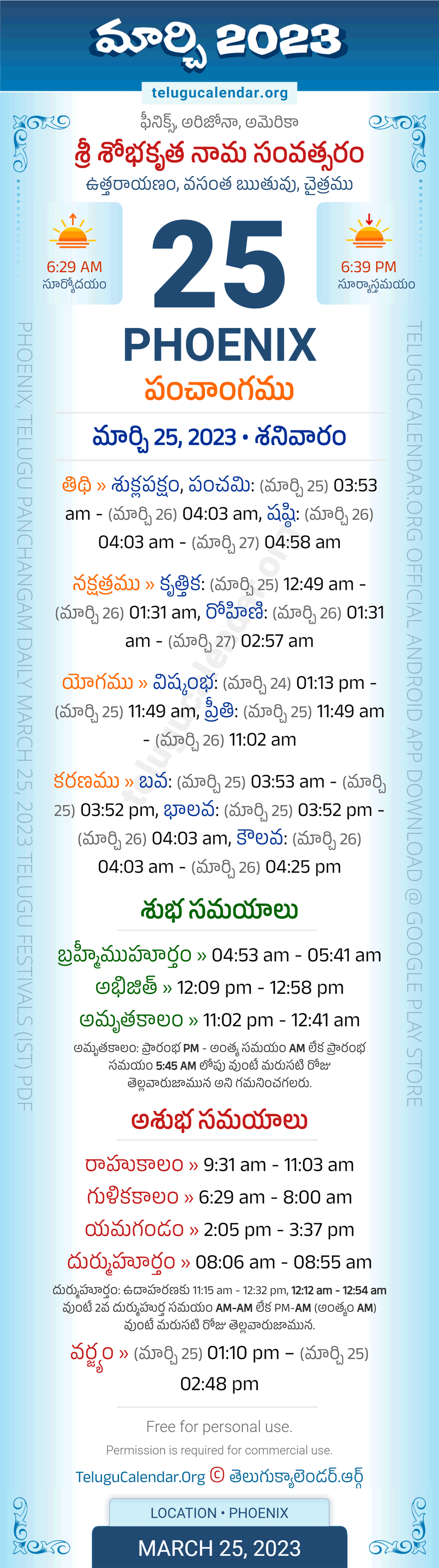 Download » March 25, 2023 » Phoenix (USA) Telugu Panchangam Daily Sheet with Auspicious and Inauspicious Timings.
