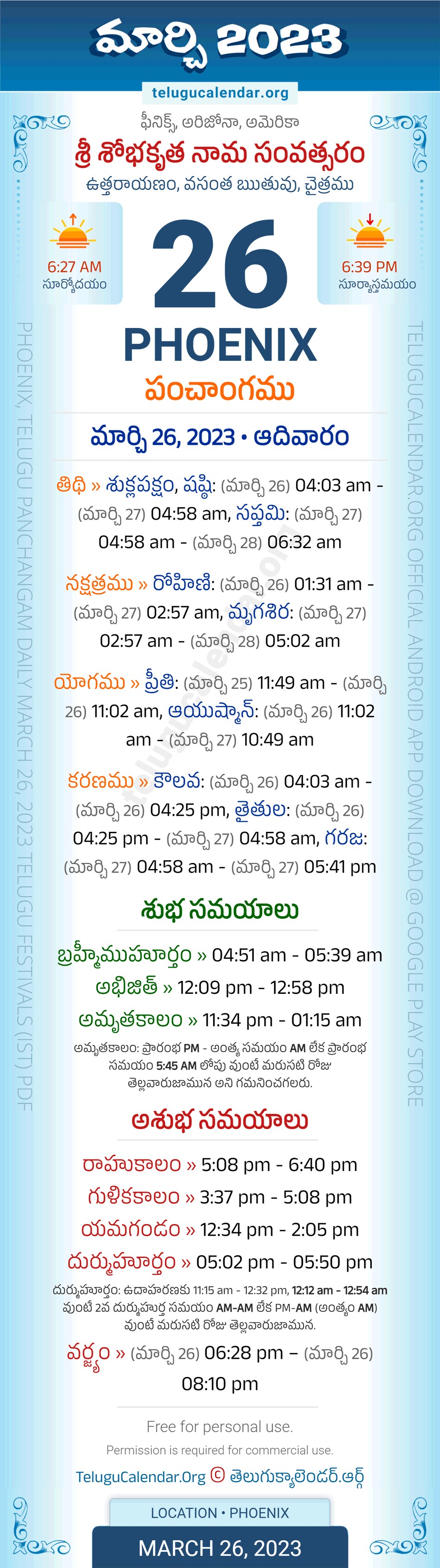 Download » March 26, 2023 » Phoenix (USA) Telugu Panchangam Daily Sheet with Auspicious and Inauspicious Timings.