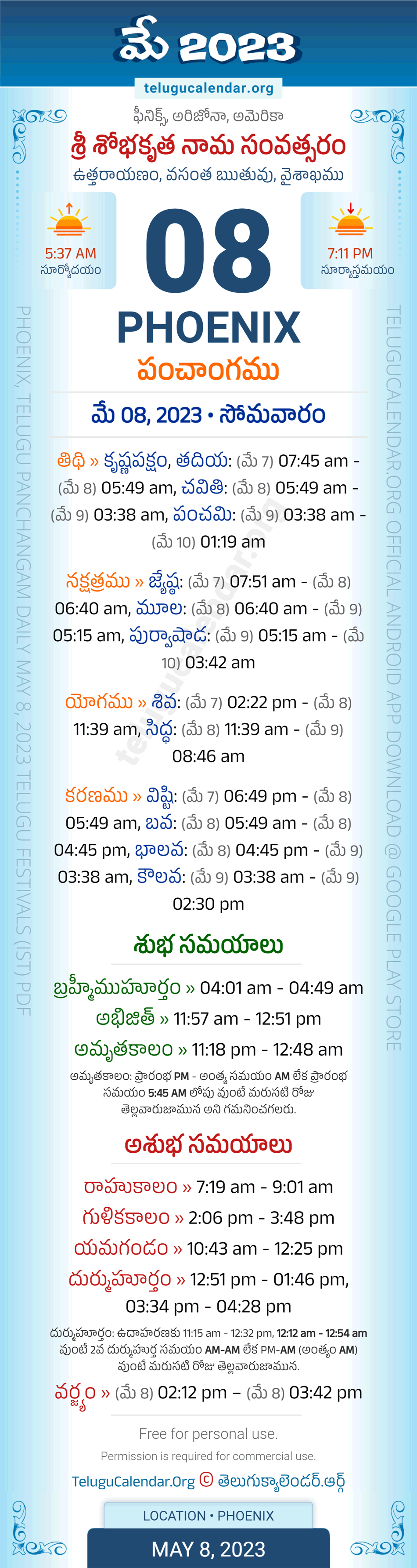 Download » May 8, 2023 » Phoenix (USA) Telugu Panchangam Daily Sheet with Auspicious and Inauspicious Timings.