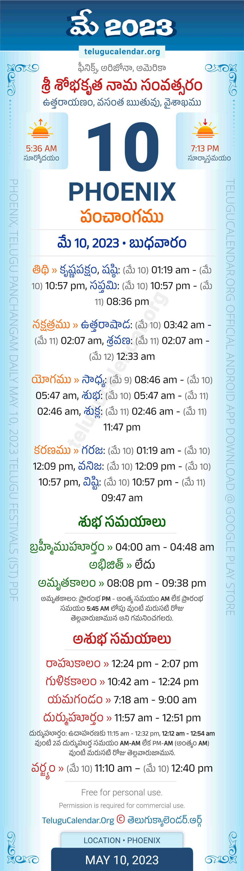 Download » May 10, 2023 » Phoenix (USA) Telugu Panchangam Daily Sheet with Auspicious and Inauspicious Timings.