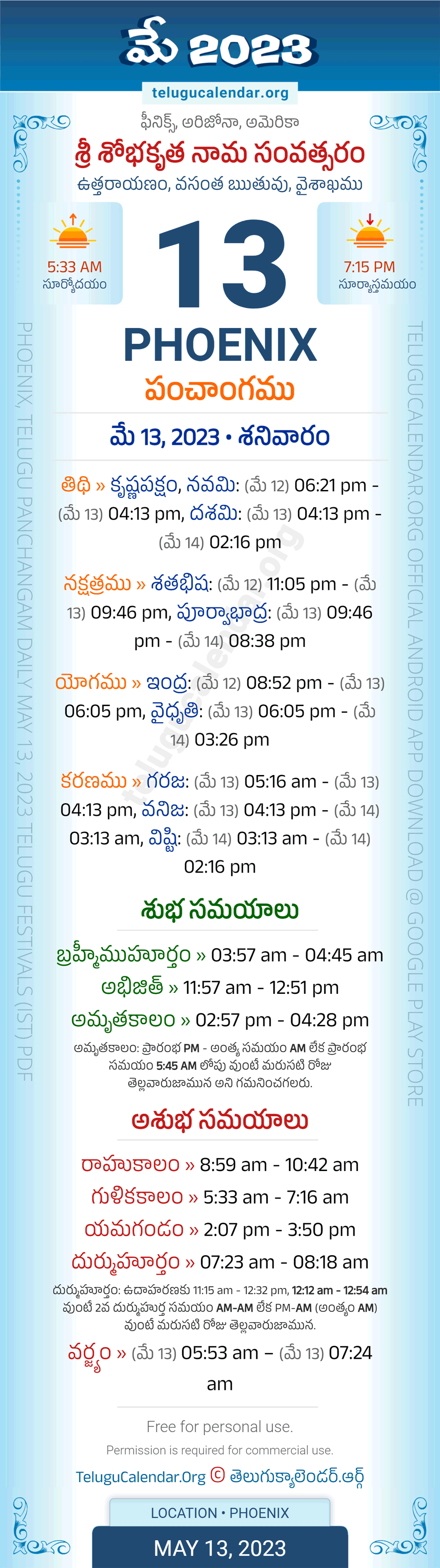 Download » May 13, 2023 » Phoenix (USA) Telugu Panchangam Daily Sheet with Auspicious and Inauspicious Timings.