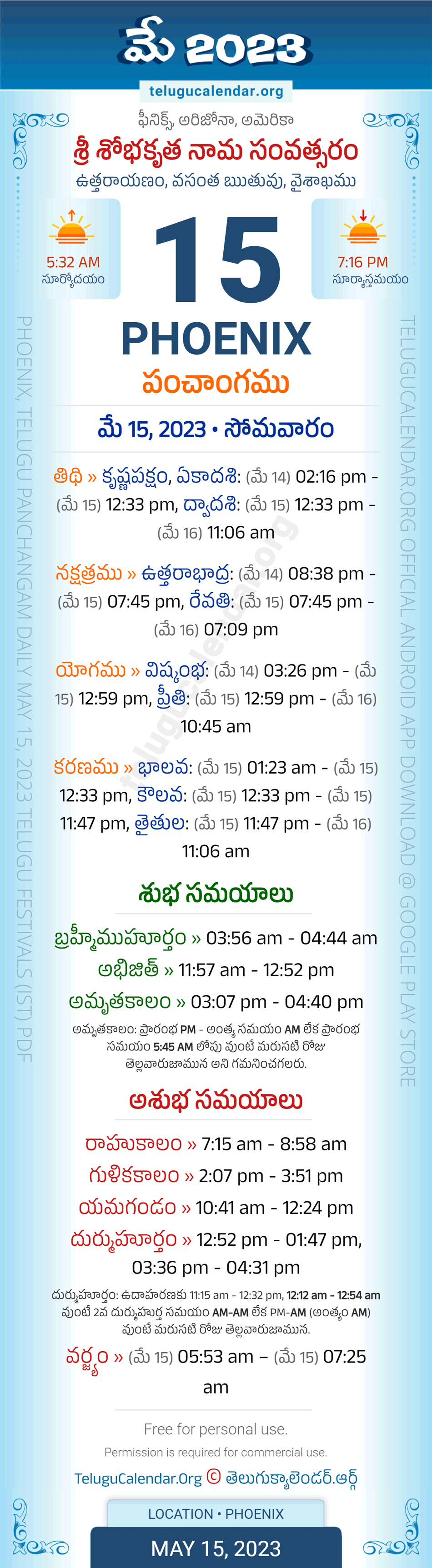 Download » May 15, 2023 » Phoenix (USA) Telugu Panchangam Daily Sheet with Auspicious and Inauspicious Timings.