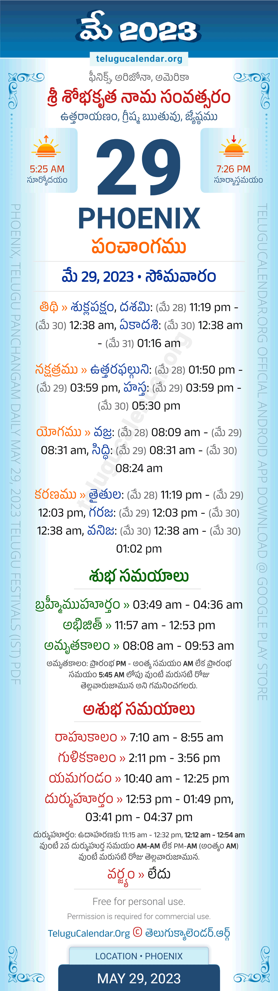 Download » May 29, 2023 » Phoenix (USA) Telugu Panchangam Daily Sheet with Auspicious and Inauspicious Timings.
